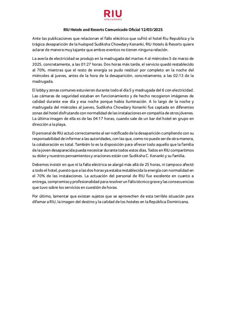 Ante las publicaciones que relacionan el fallo eléctrico que sufrió el hotel Riu Republica y la trágica desaparición de la huésped Sudiksha Chowdary Konanki, RIU Hotels & Resorts quiere aclarar de manera muy tajante que ambos eventos no tienen ninguna relación.